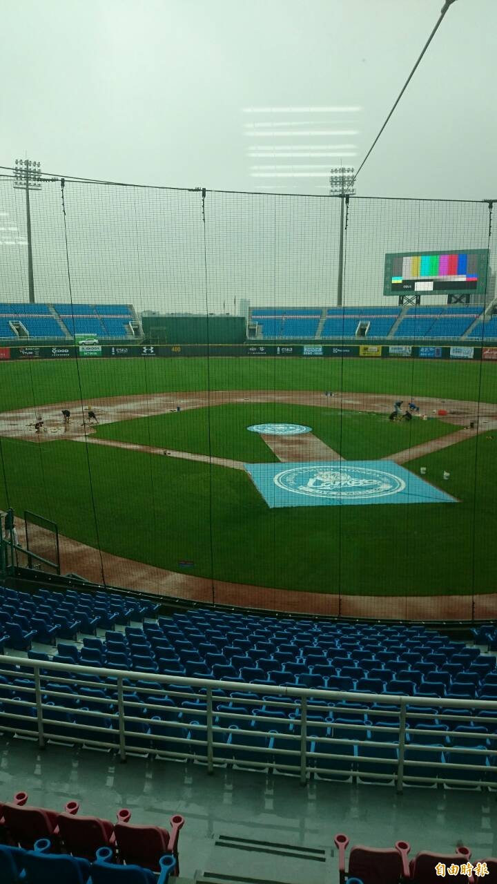 稍緩,僅飄下毛毛細雨,聯盟工作人員目前正動員,以海綿吸水搶救場地,朝準時開