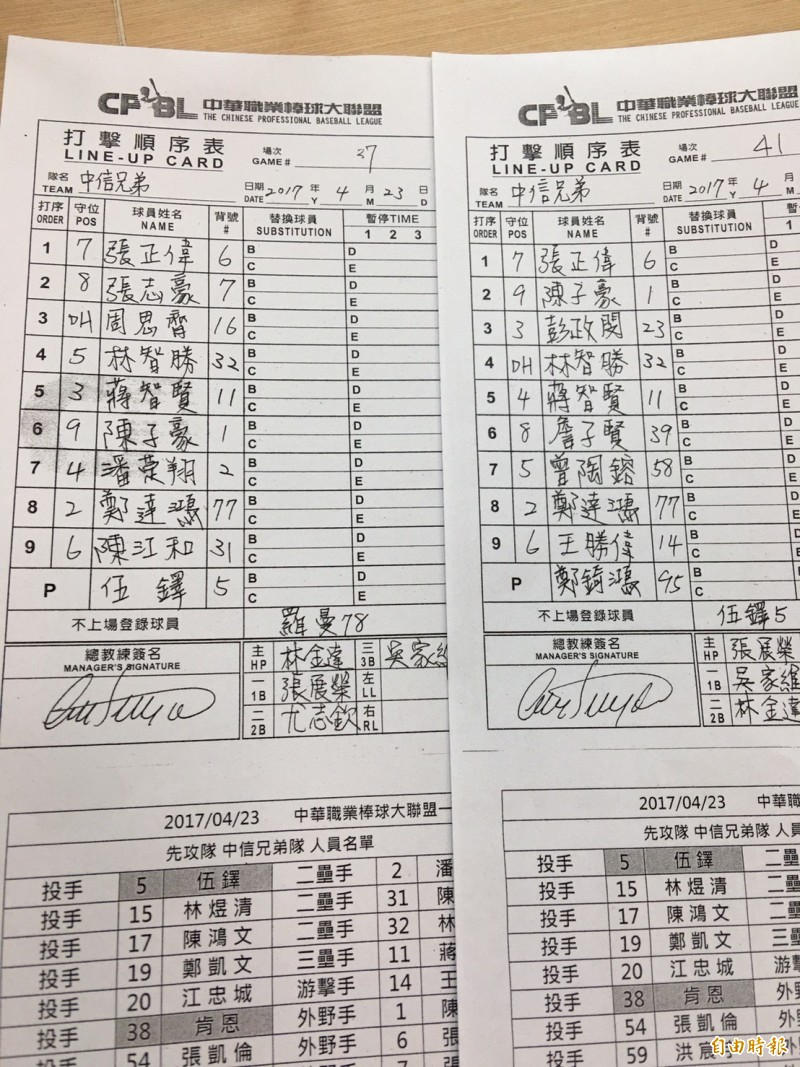 手寫錯成鄭達鴻,開賽後才又換回陳家駒蹲捕,他還因此祈禱:「陳家駒千萬別受傷!」