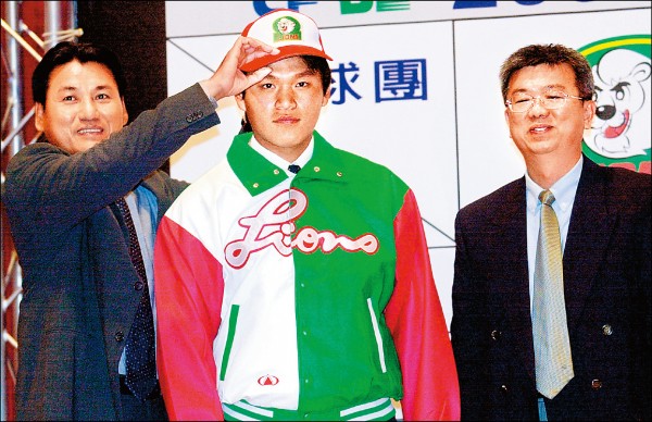 潘威倫(中)2003年1月加盟統一獅,由總教練謝長亨(左)為他戴上球帽(資料照)