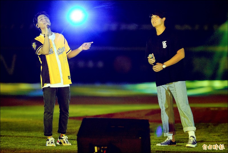 歌手蔡旻佑(左)與兄弟球員高宇杰合唱「我可以」。(記者廖耀東攝)