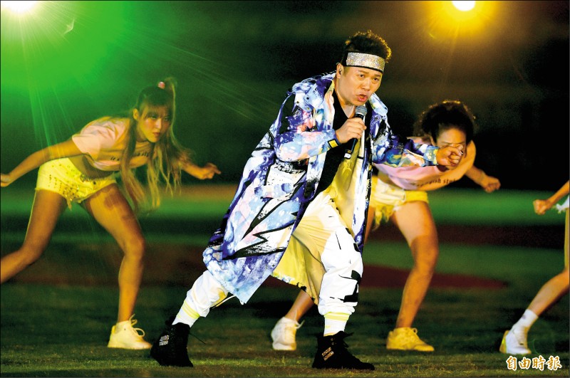 藝人卜學亮以「超跑情人夢」嗨翻全場球迷。(記者廖耀東攝)