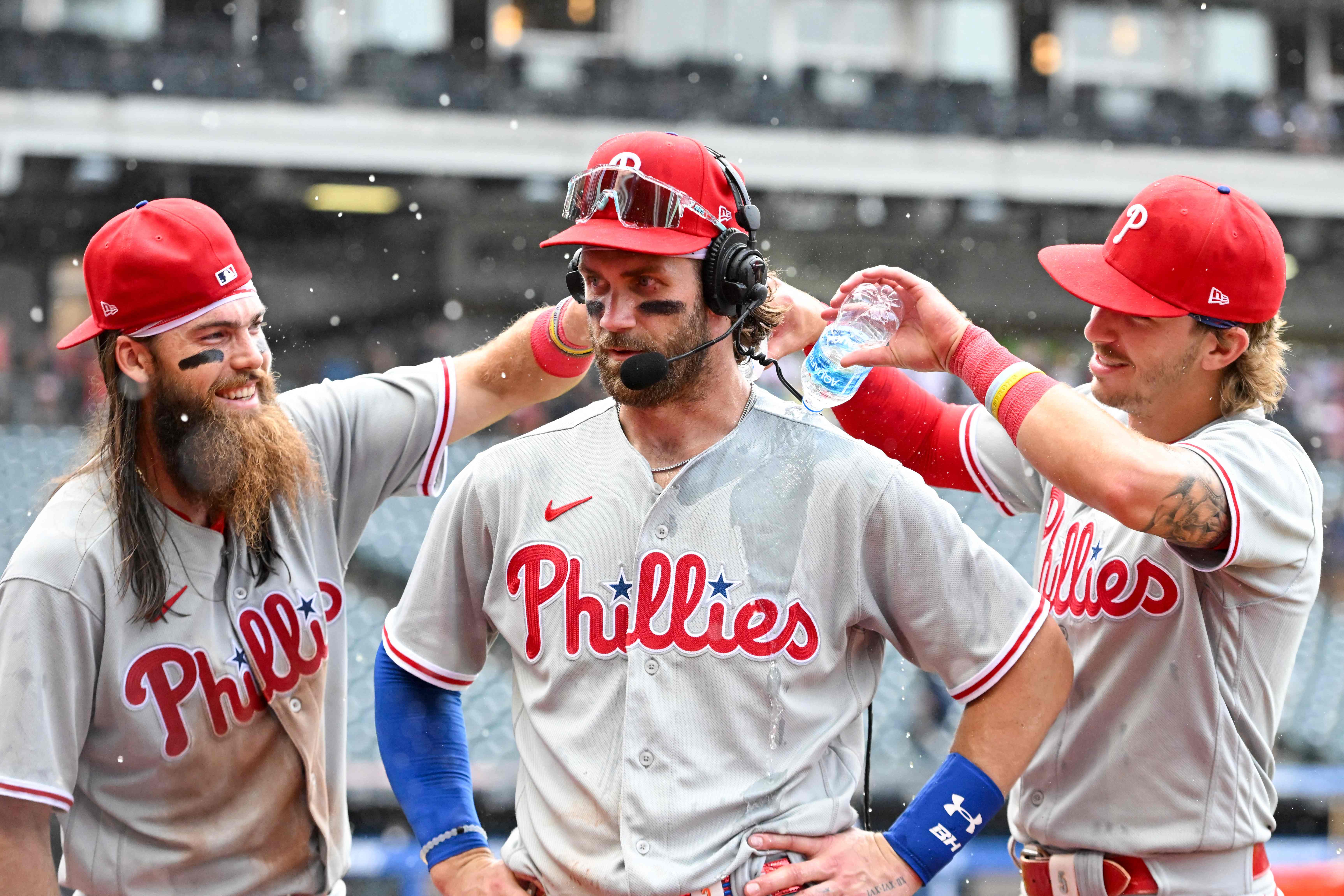 費城人隊重砲哈波(中)延長10局上揮出關鍵安打,助隊告捷,賽後接受隊友水洗慶賀。