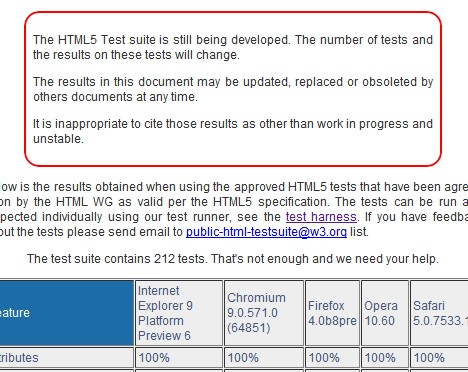 出此一HTML5測試套件仍在開發中,測試的數量及結果都將持續變動,因此該份文件隨時