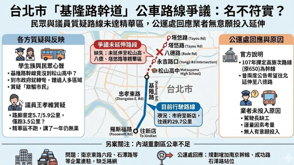 台北市公車「基隆路幹線」遭民眾質疑名不符實,有學生族反映,該路線實際行駛範圍僅