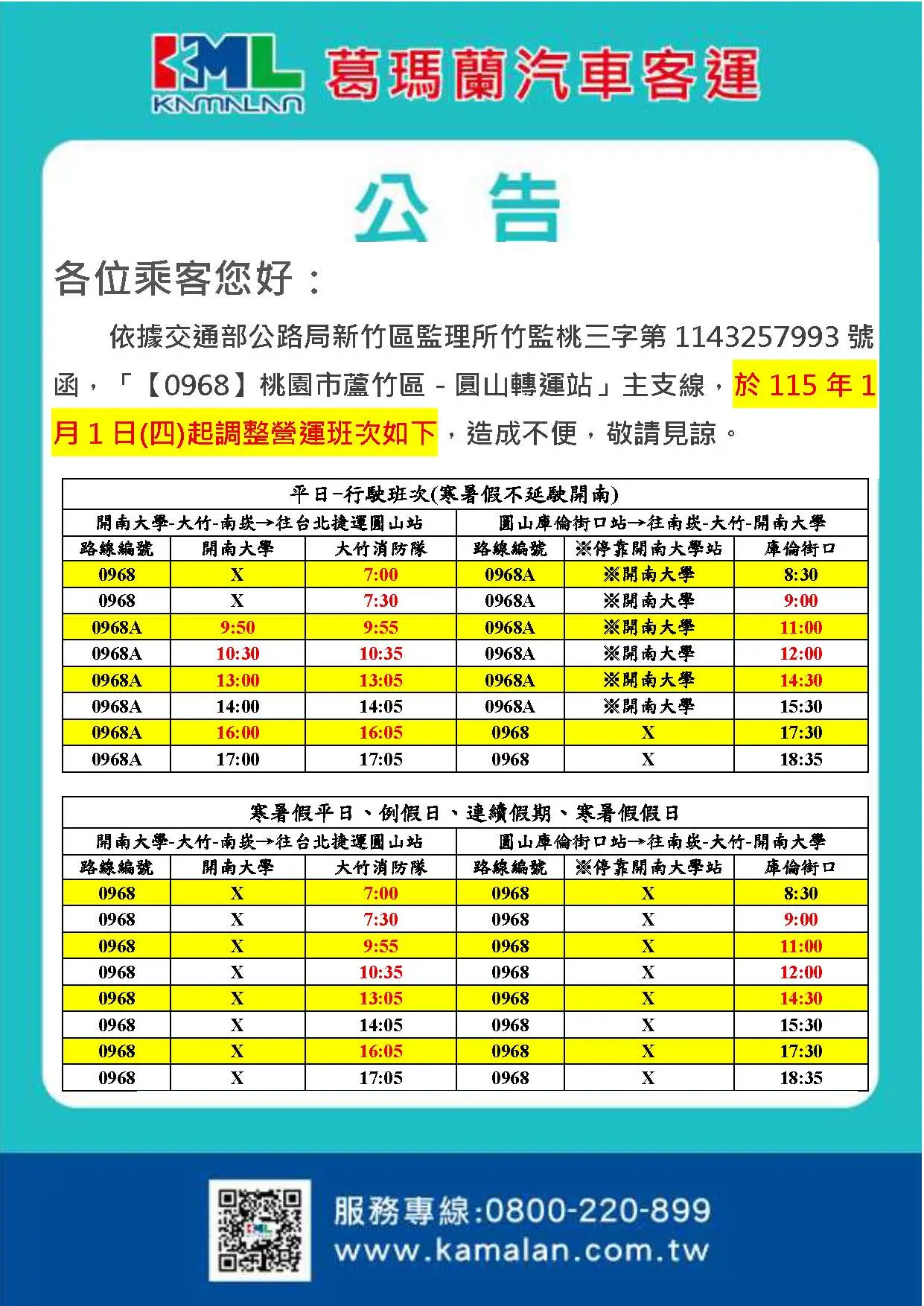 ▲ 開南大學時刻表僅平常日適用,例假日/寒暑假改由大竹消防隊發車