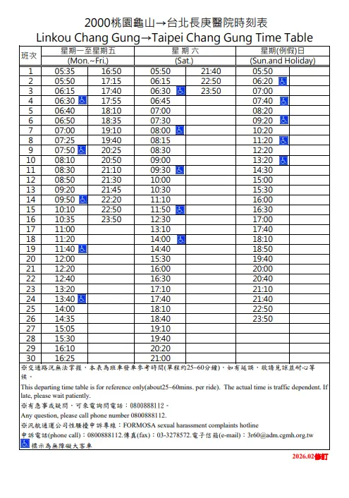 平常日 桃園長庚轉運站 14:40/16:40/17:05/17:20/19:30/20:00/21:50 班次調整為