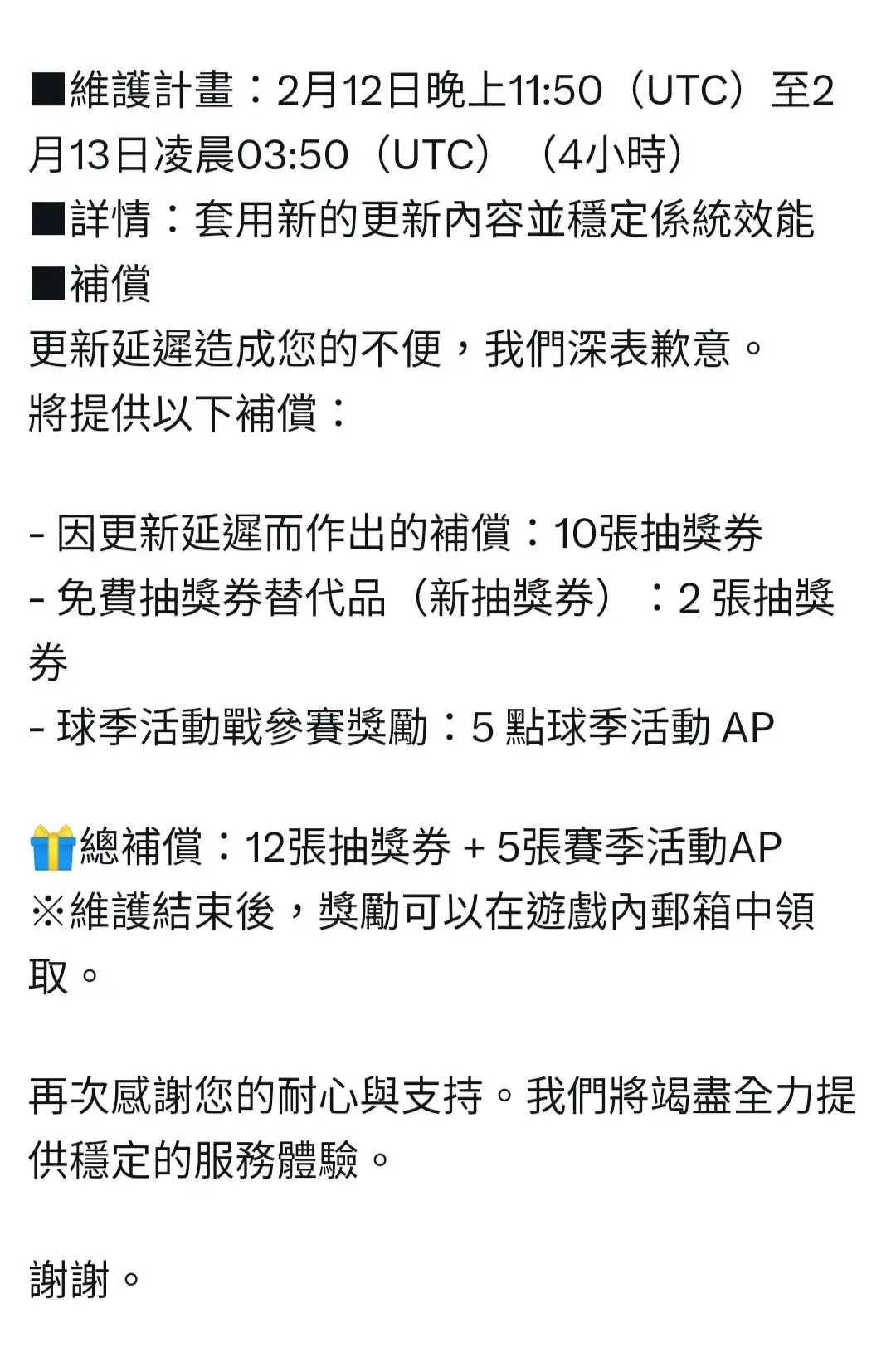 剛剛公告更新了,台灣時間早上7:50到11:50更新,總共四小時