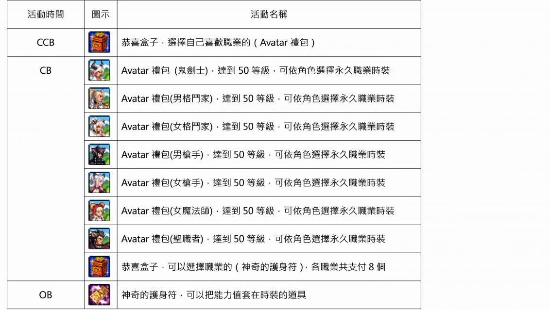 I. 於CCB期間達成等級50級的冒險家,CB時使用同帳號登入遊戲並創立角色,即可至獎勵