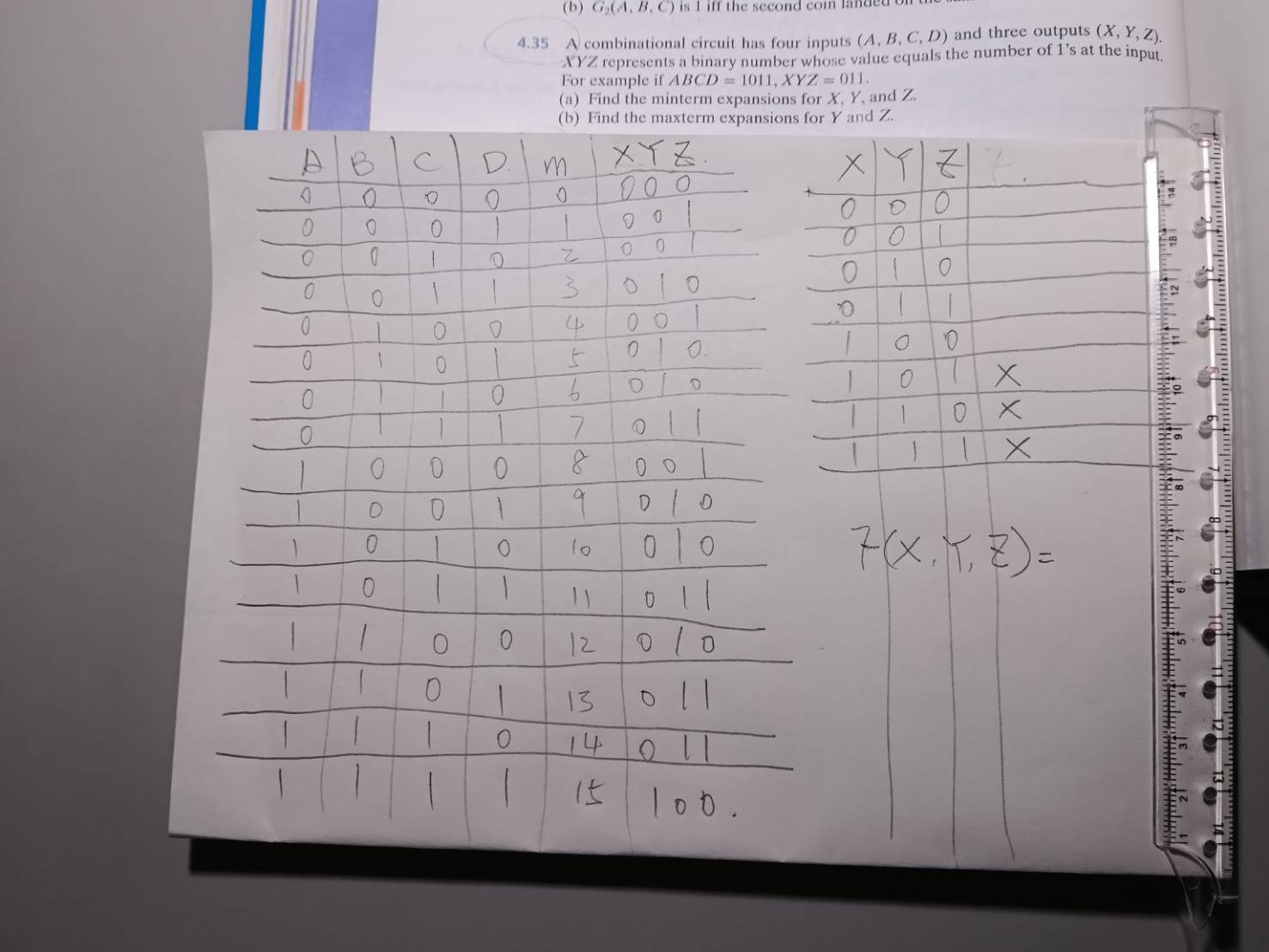 想請大大們, 圖中4.35題我該怎麼寫?! F(X,Y,Z)= ? 如何assign 0/1 給Truth Table?! 是這樣寫的嗎?! --