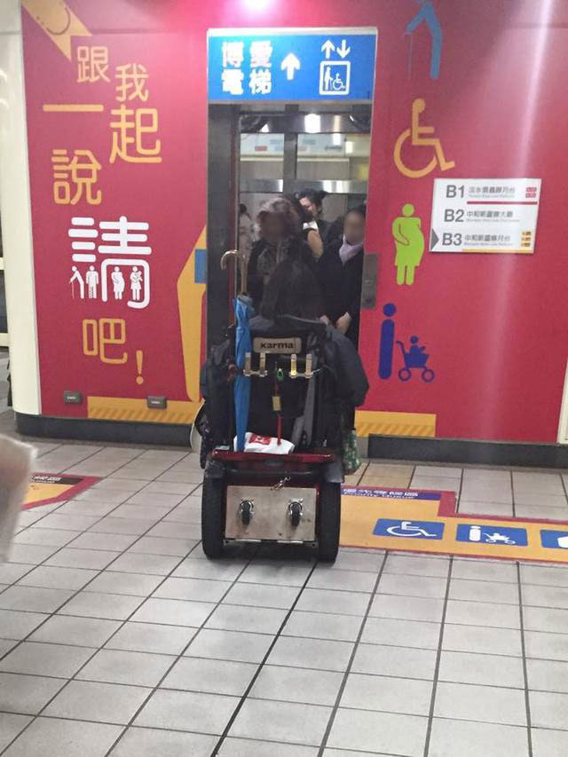 有網友在臉書《爆料公社》粉絲專頁上po文,照片中一名坐著電動車的女子在電梯門外,