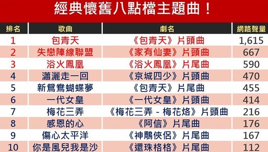 網路溫度計根據關鍵字統計,排行出網友們最懷年的經典八點檔主題曲,前三名由當年紅