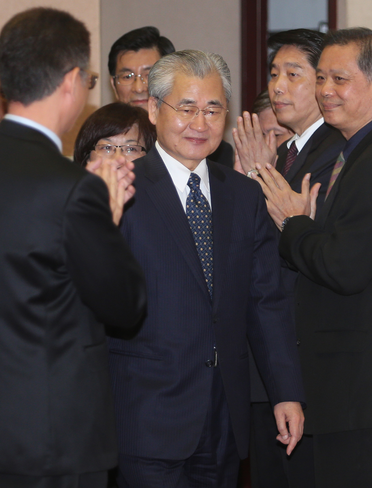 : : 行政院長毛治國(中)率內閣完成總辭程序與內閣合影,在閣員掌聲中走向前深深一鞠躬