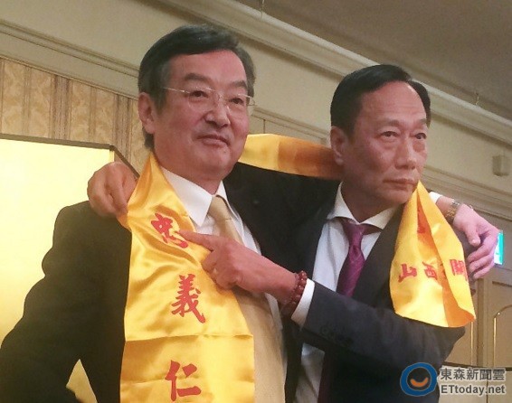 ▲鴻海董事長郭台銘與夏普社長高橋興三共披一條關公圍巾。(圖/翻攝自《每日新聞》官網)