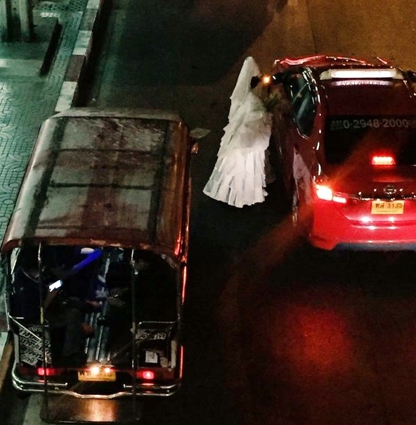 圖擷取自:Sanook.com網友AquariusNick25日在網路上發表圖文稱,曼谷某地晚上驚現「觀音」在路邊打車,好多司機都不敢上前。該網友說,她在逛街時突然看見一名身穿白衣的女子,她手裡還抱著一個裝有綠枝條的瓶子,打扮成觀音的樣子在路邊打車。很多司機都不敢上前,好長時間後才有一名膽大的出租車司機停車讓「觀音」上車。http://uc.udn.com.tw/photo/2016/04/29/99/2092308.jpg