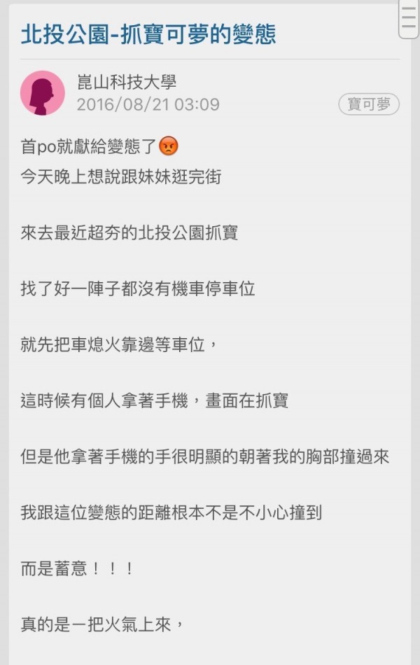 姊姊事後在網路論壇《Dcard》發文,指出「希望抓寶可夢的大家一定也要注意自己周遭