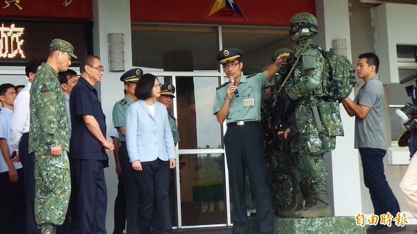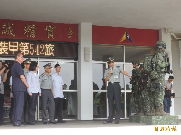 總統蔡英文今天視導542旅時,先聽取軍備局展示新式戰鬥個裝並提問。(記者廖雪茹攝