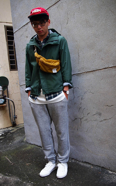 不過跟照片不一樣的地方是 背了腰包後 外面再穿上外套