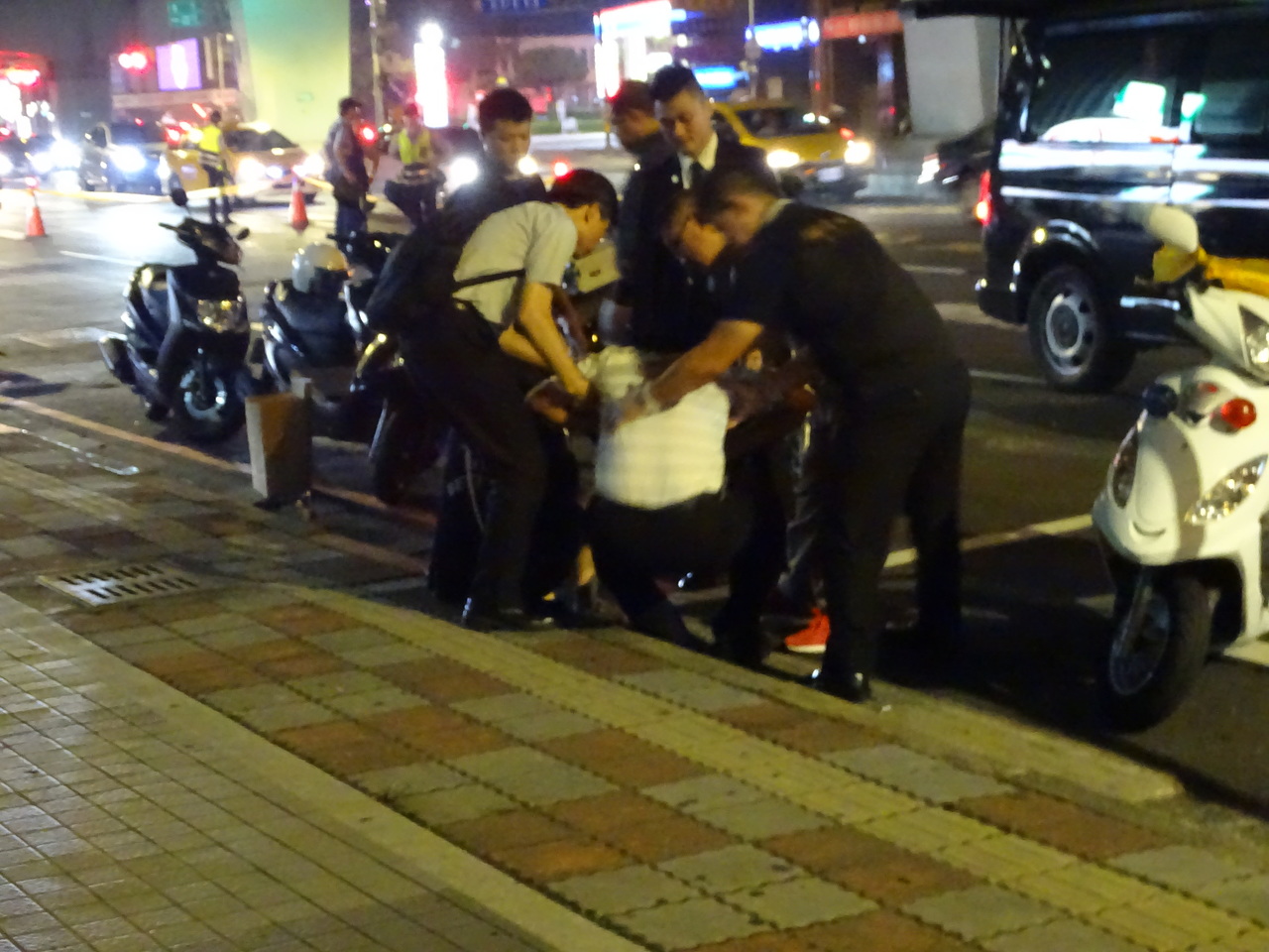 : 癱倒在地。警方目前仍在調閱行車紀錄器以及監視器釐清肇事原因。