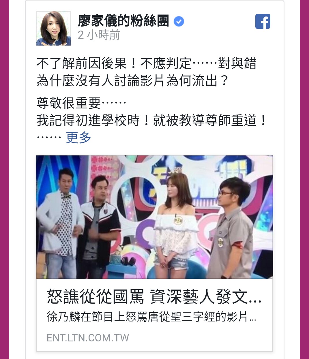 望露》中演出的女星廖家儀,今也在臉書發文,認為徐乃麟是照顧大家的大長輩,曾因女