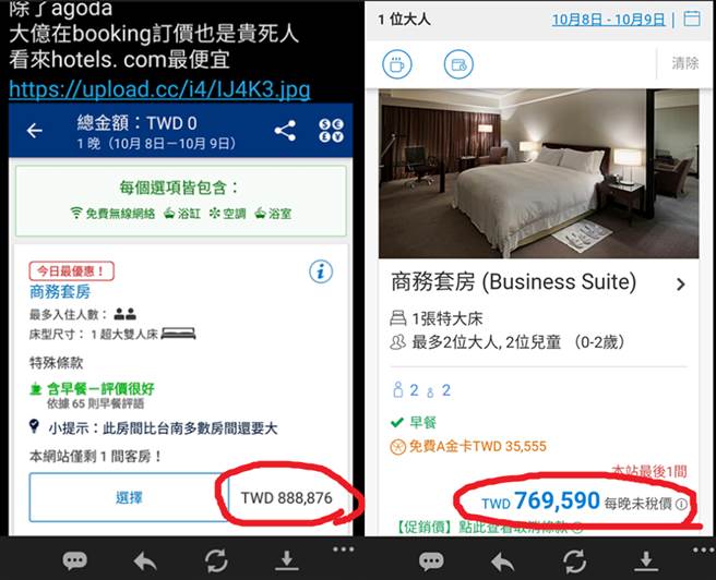 晚上的住宿價格,一般的套房訂價是76萬9590元,雖然是天價,但用另外一家訂房網Book