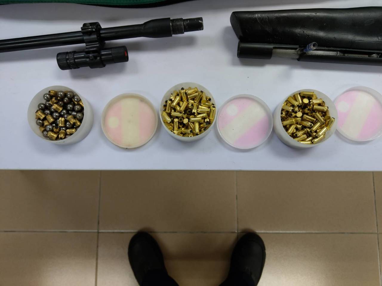 警方到場後起獲1把獵槍、233顆底火席格釘以及57顆鋼珠,陳供稱說獵槍是最近以8000元