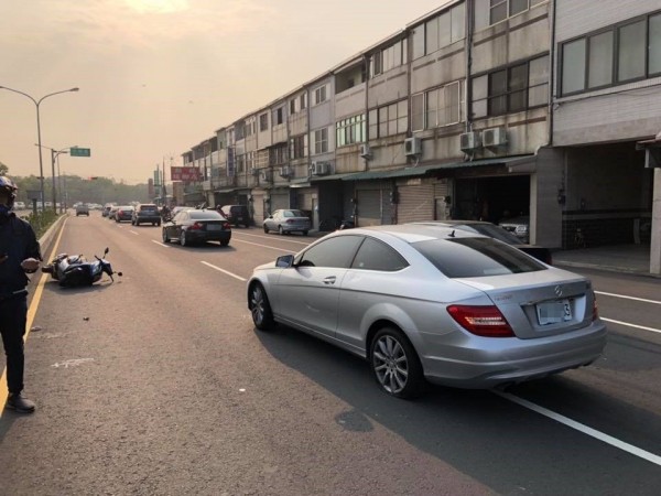 這起車禍造成賓士車左側後方保險桿、車門受損,機車則是外殼破裂。(圖擷取自爆料公
