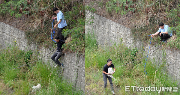 急救援小組志工冒險從約3層樓高的河岸跳下,終於順利將受困的狐狸犬營救上岸。