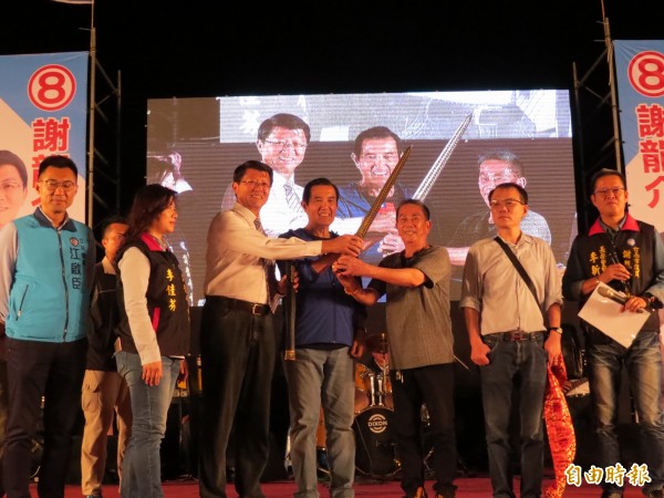 謝龍介(左三)獲鑄劍師贈予一把寶劍,馬英九擔任見證。(記者蔡文居攝)