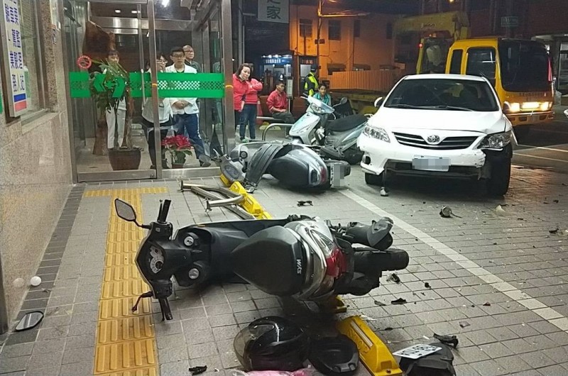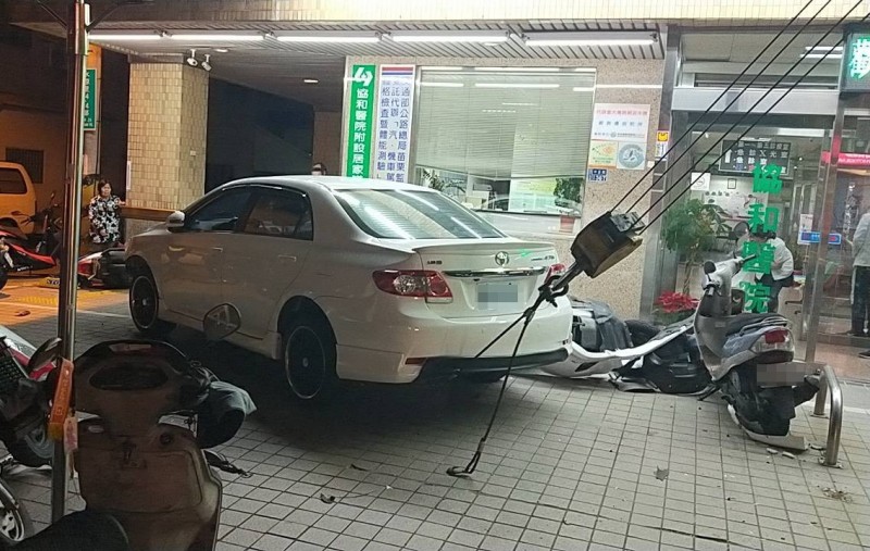 員警趕赴發現,一輛白色小客車衝上醫院前騎樓,原本停放在騎樓上的14輛機車,猶如保