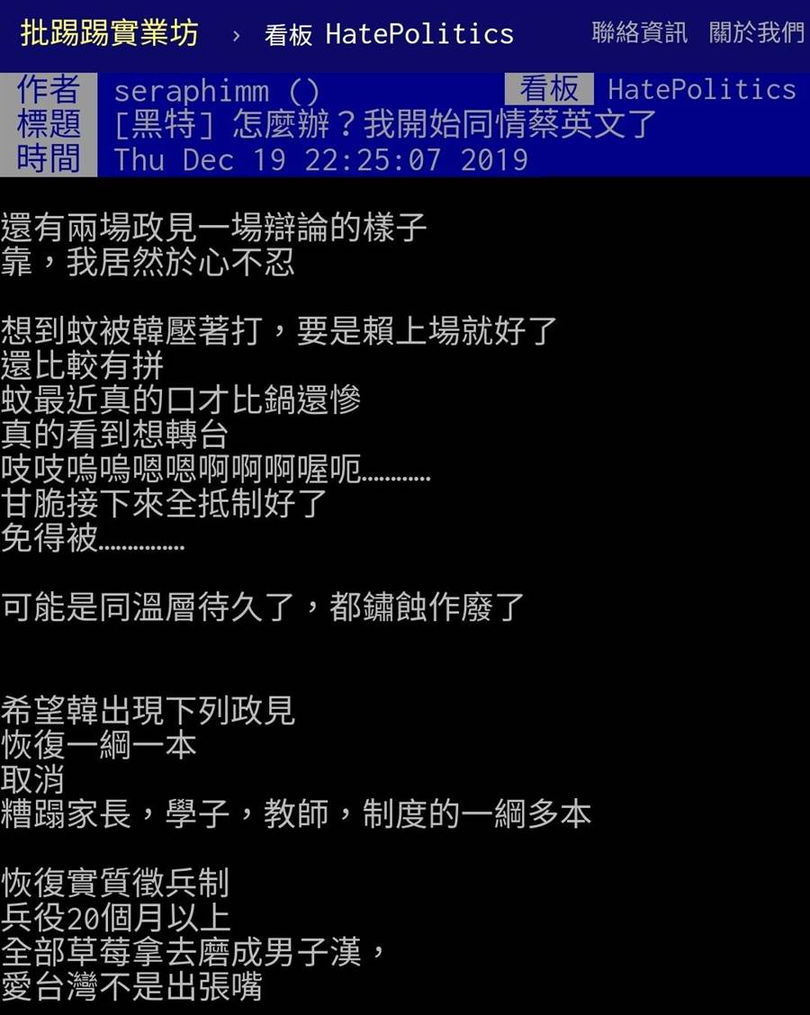 網友在PTT論壇發文《怎麼辦?我開始同情蔡英文了》寫道:「還有兩場政見一場辯論的