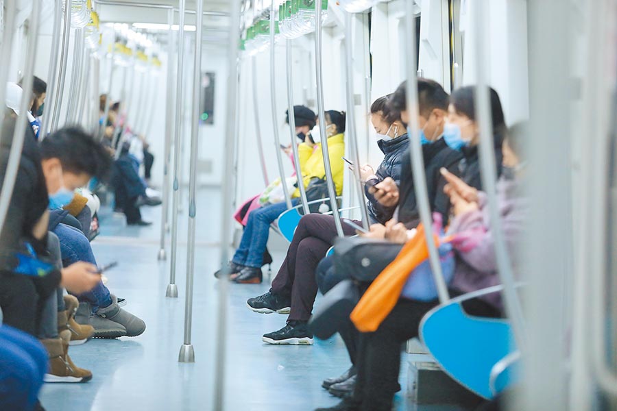 罩的乘客乘坐北京地鐵十號線。(中新社)