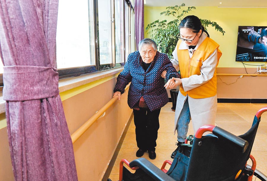武漢社會福利院爆發群聚感染,12人確診。圖為福建養老院,工作人員幫助老人進行行走