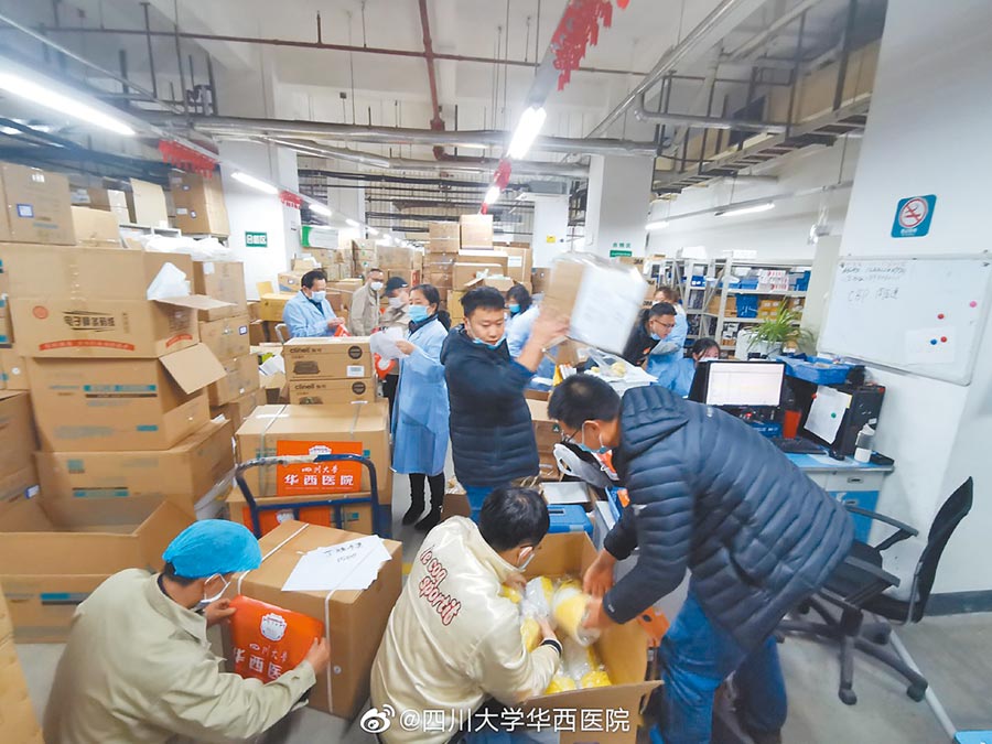 四川大學華西醫院醫療隊人員整理準備送去湖北的物資。(取自新浪微博@四川大學華西
