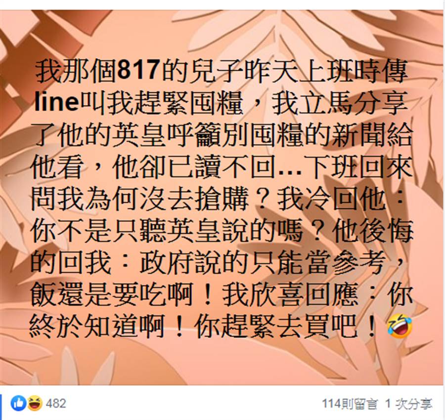 粉表示,他817兒子是投蔡英文,叫他趕快備一些物資,他就把蔡英文說的話給他兒子看