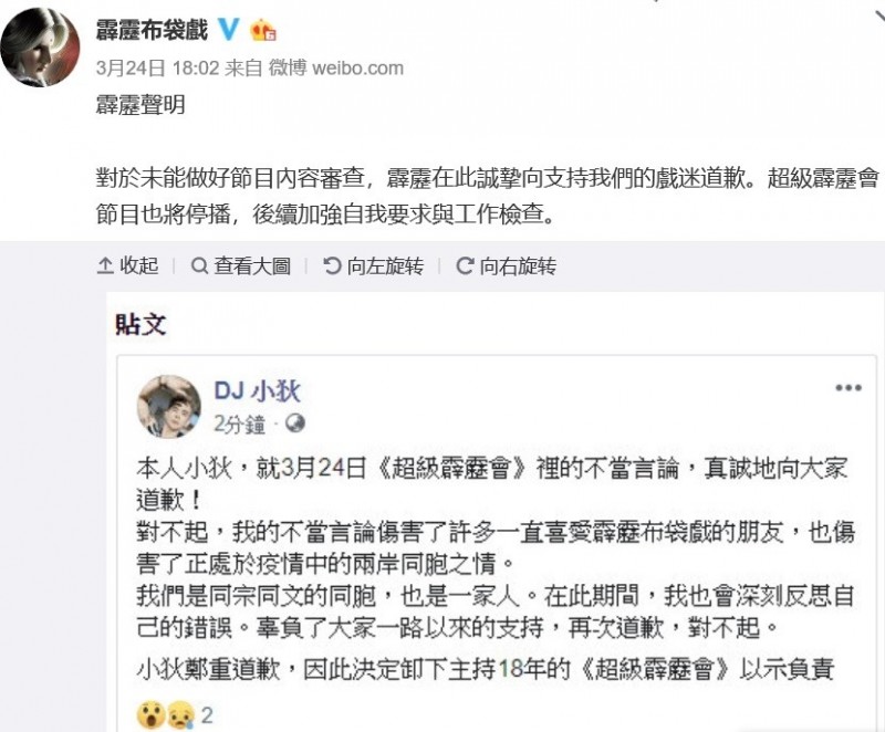 歉。超級霹靂會節目也將停播,後續加強自我要求與工作檢查。」