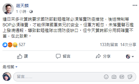 章,趙天麟今(22)晚也在臉書PO文道歉,坦承用詞不當。