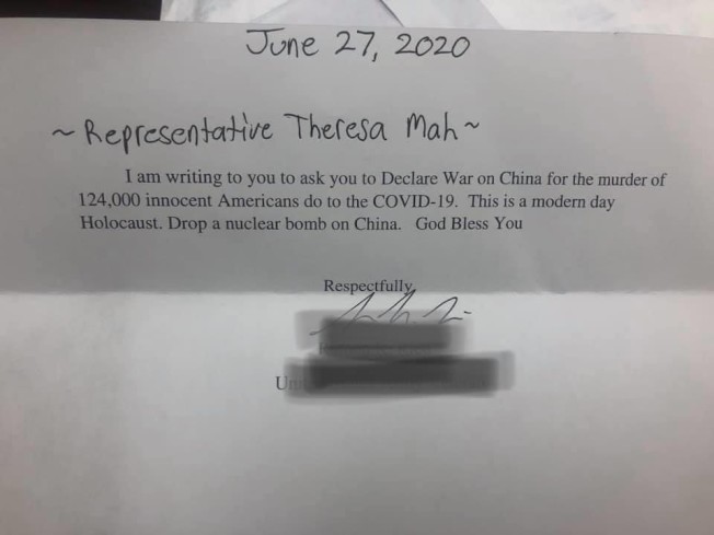 州眾議員馬靜儀(Theresa Mah)日前收到一封來信,信中寫著「要求對中國宣戰」,來