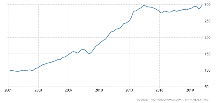 以下是2001~2020的房價指數趨勢圖