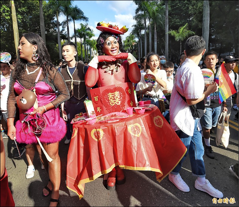 台灣同志遊行有民眾打扮成婚宴酒席桌,慶祝台灣同婚合法週年﹛]記者方賓照攝)
