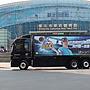 : 傳車對比,只見刪Q的宣傳車是大型貨櫃車,側面與背面都有精美的海報與電子螢幕,車