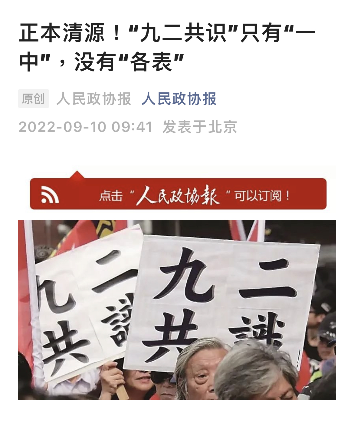 大陸《人民政協報》強調,「九二共識」只有「一中」,沒有「各表」。(截圖自人民政協