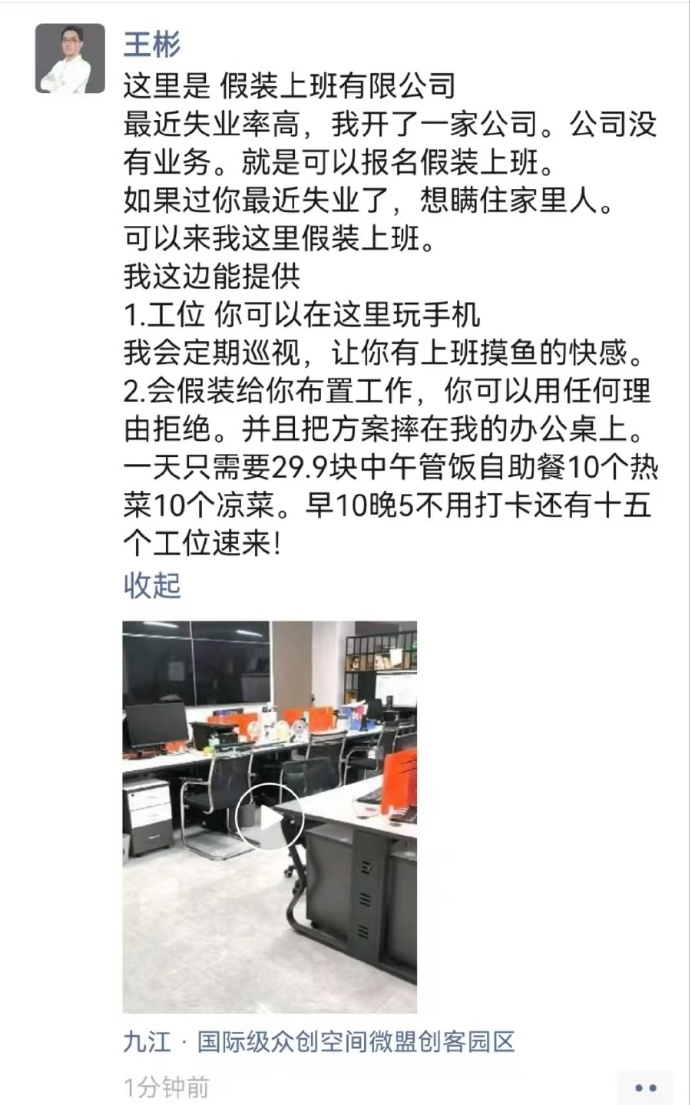 群,開了一家「假裝上班有限公司」,在網上引發熱議。相關話題登上微博熱搜。