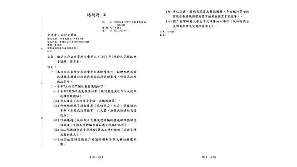 王鴻薇po出的公文是總統府公共事務室整理民眾關注議題,去函行政院做為政府施政參考