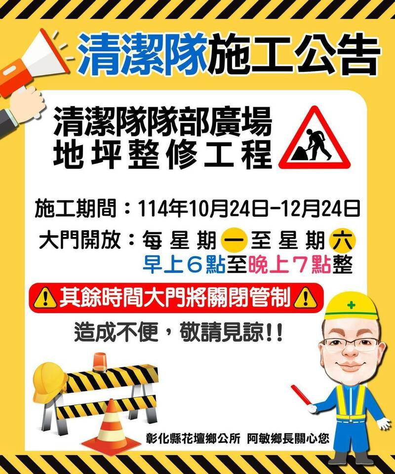 彰化縣花壇鄉清潔隊因為施工,除了特定時段提供隊部倒垃圾,其餘時間將會關閉管制。