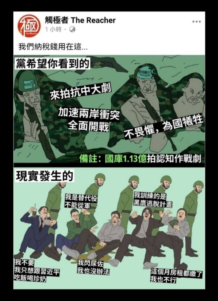 躲好」;臉書粉專「觸極者」則是引用喬治歐威爾名言嘲諷「所有的戰爭宣傳,都來自那