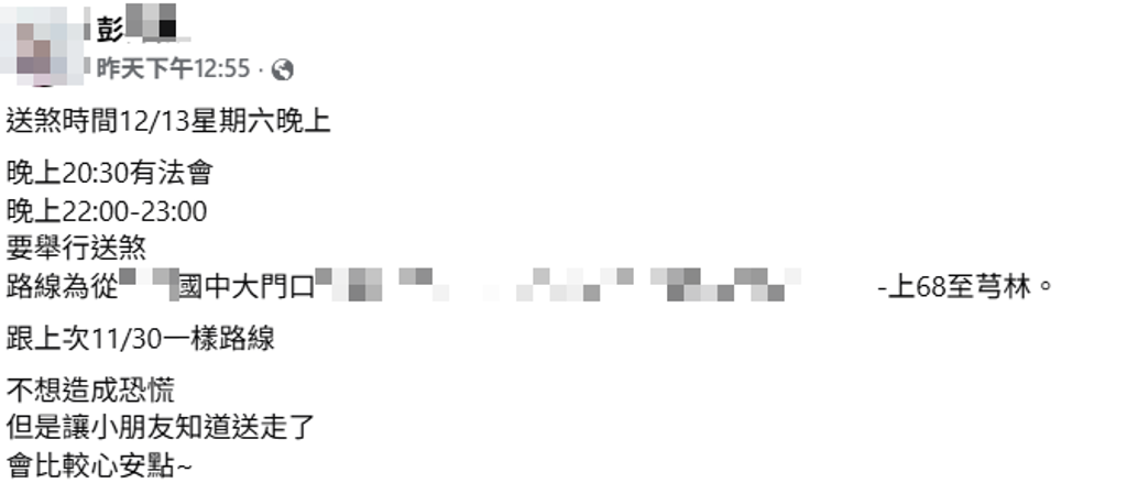 當地里長發文公布相關資訊。(翻攝當地里長臉書)