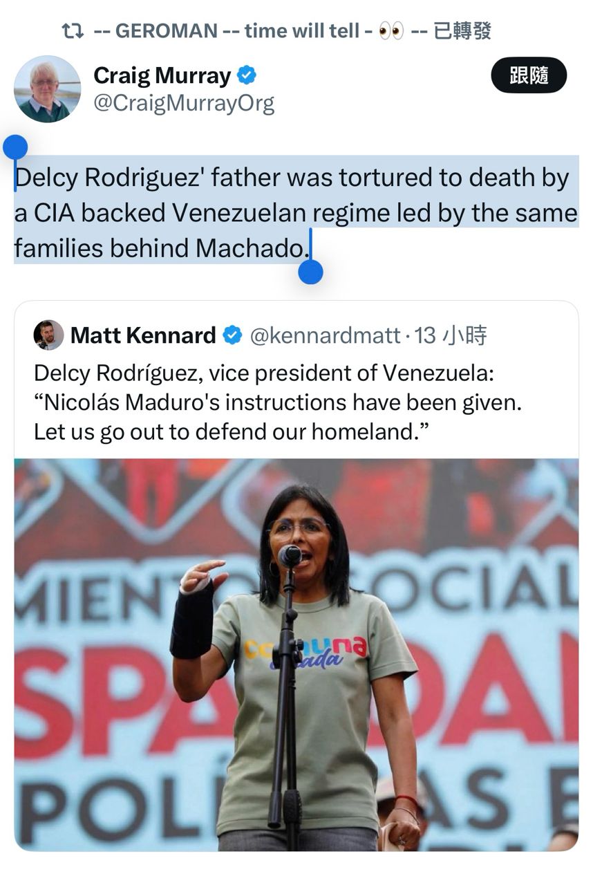 目前Delcy Rodriguez(接任委內瑞拉總統的VP),在宣示就職演說上,嚴厲譴責美國侵略