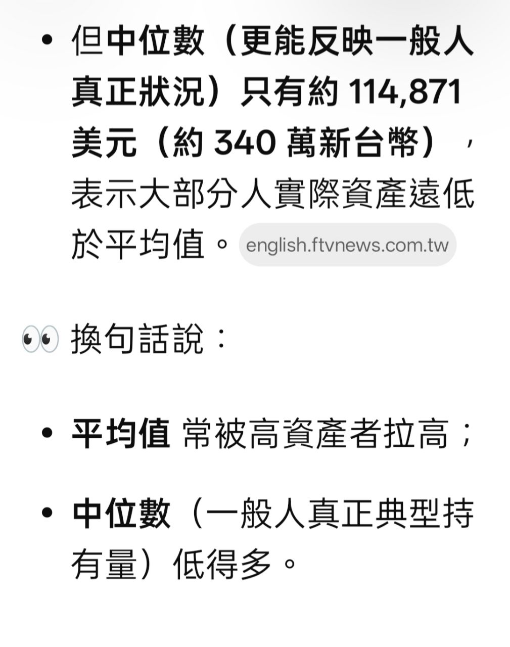 但是如果把房產扣掉,用中位數去看,每個人資產約340萬
