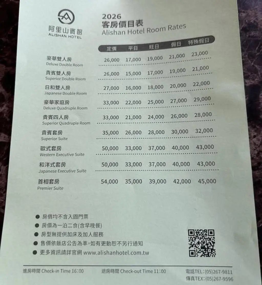 阿里山賓館2026年價目表曝光,平日雙人房一晚房價1萬5千元;最貴的首相套房,遇特殊