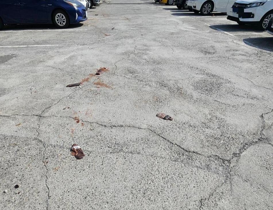 ▲高雄停車場驚見「檳榔炸彈」!一壓爆紅汁多車中招。(圖/記者賴文萱翻攝)